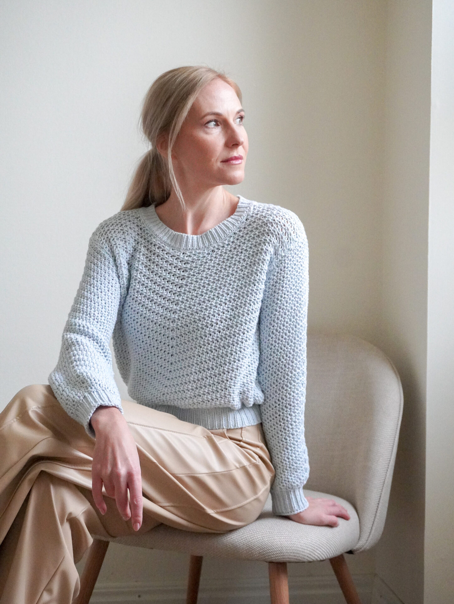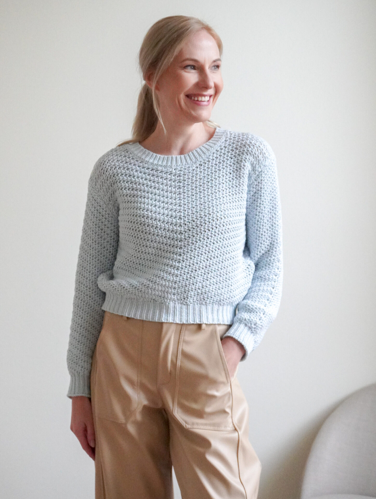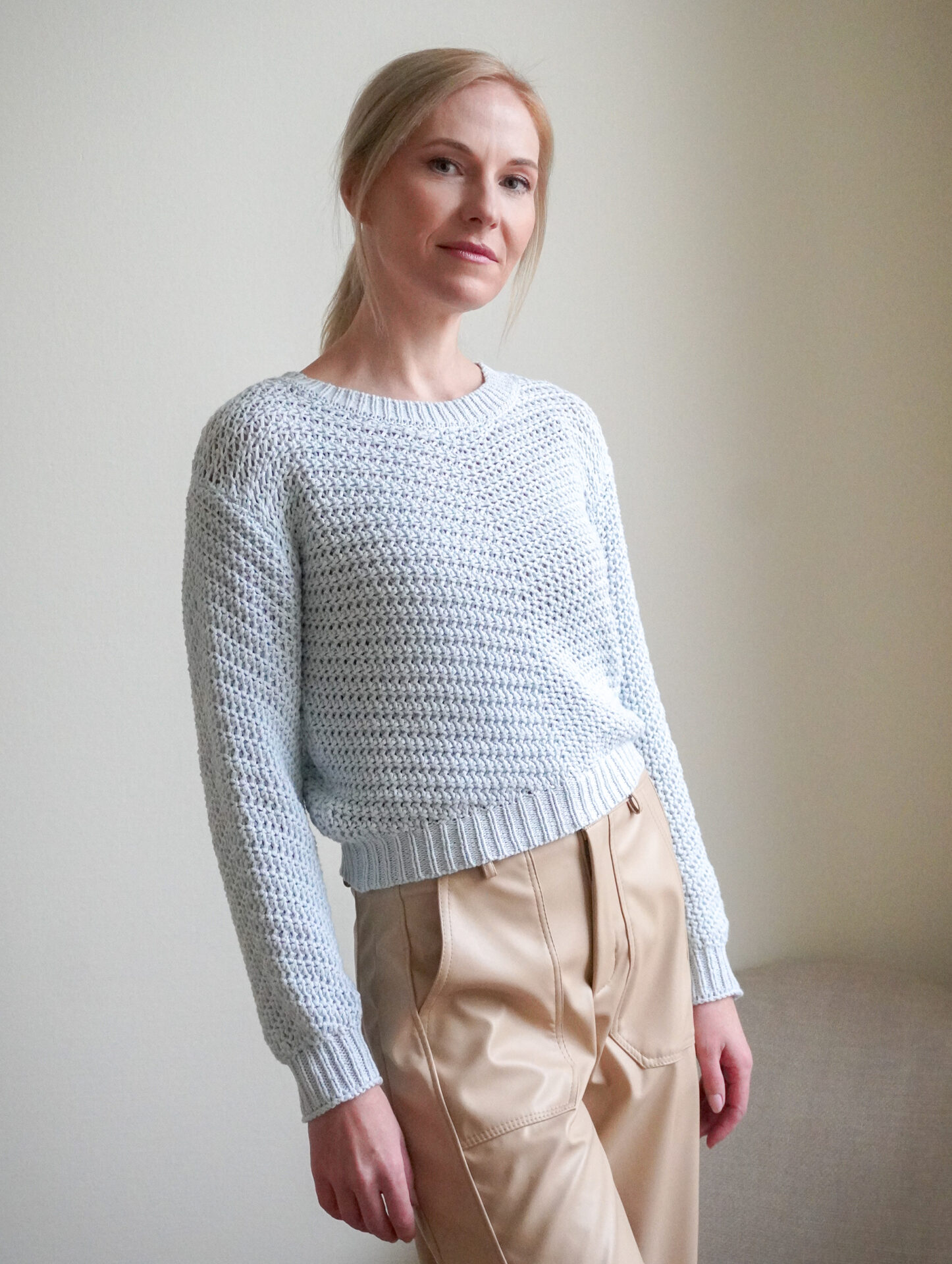 Värv: helesinine Materjal: 55% akrüül, 45% puuvill Hoolduses järgi tootel olevat silti.